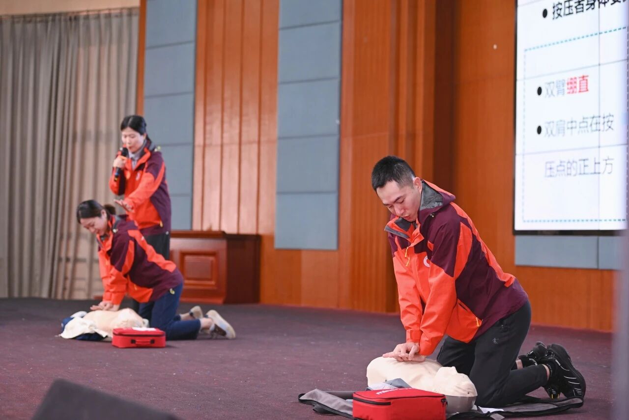 理论学习过后,互动演练成为活动的核心亮点。现场准备急救模拟人与AED训练机,参与者分批分组开展实操练习,导师团队全程巡回指导,逐一纠正动作细节,确保每一位参与者都能掌握心肺复苏术与AED的规范操作。